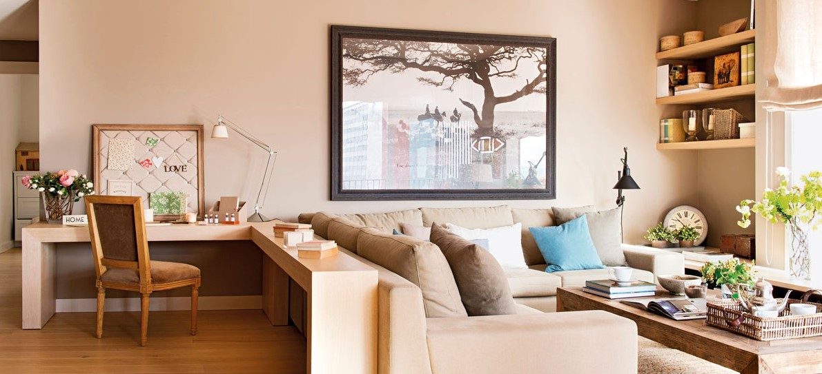 En este siguiente ejemplo traemos otra buena forma de decorar un salón con un sofá rinconero, generando un salón a dos ambientes muy interesante. Y es que tal y como apreciamos aquí, se ha utilizado la parte trasera del sofá para crear una especie de mueble separador, combinado además con un escritorio. Así, podemos decir que este salón con zona de despacho puede aprovecharse tanto en salones que sean demasiado amplios y en los que queramos realizar diversas funciones como en casas más pequeñas.