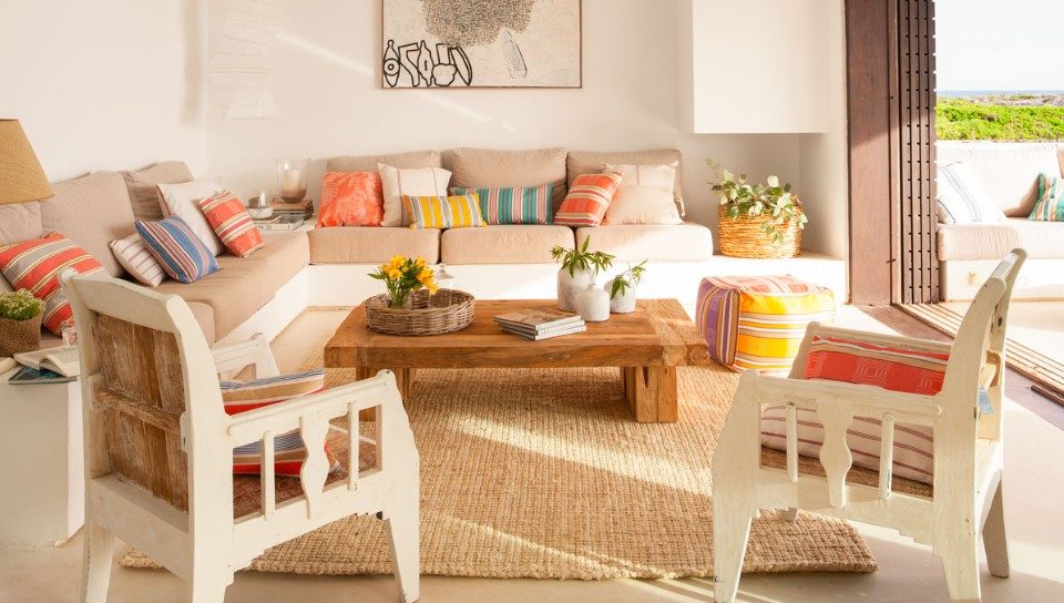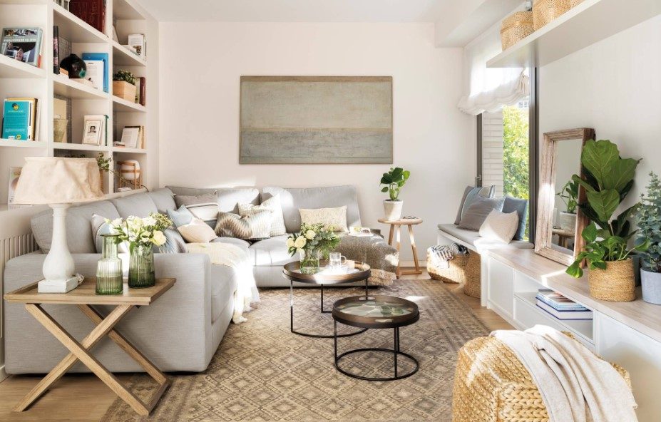 Los textiles en tonos beiges, azules y grises funcionan muy bien para complementar y la mezcla de las mesas de hierro con la mesa de madera permiten que el espacio tenga más versatilidad. Muy importante también es saber distribuir el resto de elementos en la estancia. Aquí vemos que se ha utilizado una mesita pequeña a cada lado del sofá y un mueble largo en la pared opuesta, donde podríamos colocar el televisor.