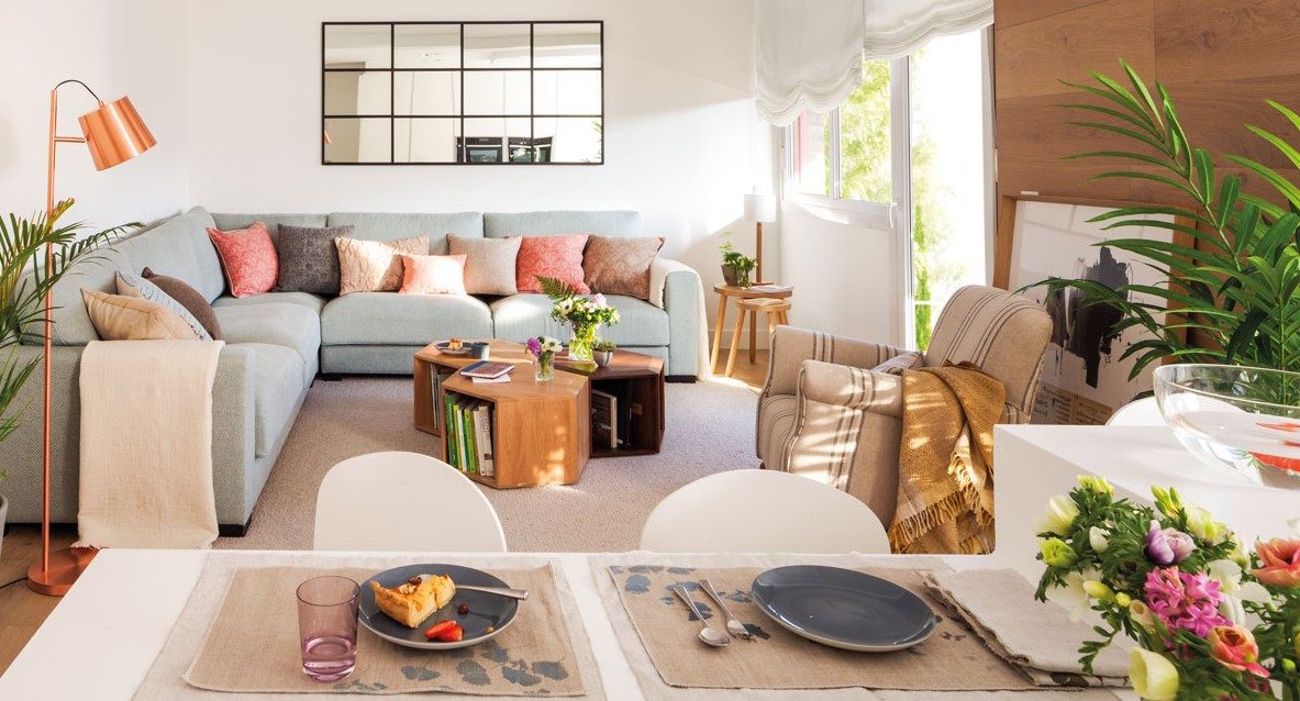 Comenzamos por una propuesta que resulta bastante atractiva, sobre todo para las personas que quieren combinar en una misma estancia el salón y el comedor. Aquí se ha creado una decoración basada sobre todo en tonos pasteles, por lo que encontramos una mezcla de tonos blancos, beiges, azules claros, etcétera. Una buena forma de decorar un salón por sofá rinconera es precisamente la de utilizar un color más llamativo para el sofá que lo distinga del resto de elementos, como sucede en este caso.