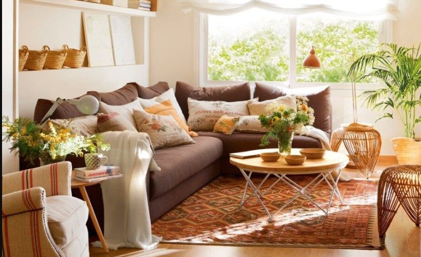 Si estás buscando aprovechar el espacio de una forma diferente a todas las opciones que hemos comentado antes, aquí te traemos otra alternativa. De nuevo, con una decoración al estilo boho se nos transporta a un salón con tonos y colores cálidos. Ya hemos explicado que una buena forma de decorar un salón con sofá rinconera es la de aprovecharse de un color diferente para este mueble, algo que aquí también sucede con el marrón oscuro del sofá.