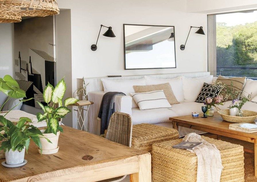 Aquí de nuevo observamos que se ha escogido un tipo de decoración boho que permite que podamos utilizar mucha fibra natural y elementos rústicos con diversos tejidos en marrón y diversas maderas. El blanco del sofá resulta el acompañante perfecto y los tonos verdosos de las plantas naturales nos ayudan a crear un ligero contraste, manteniendo en todo momento esta sensación de decoración natural y ecológica.